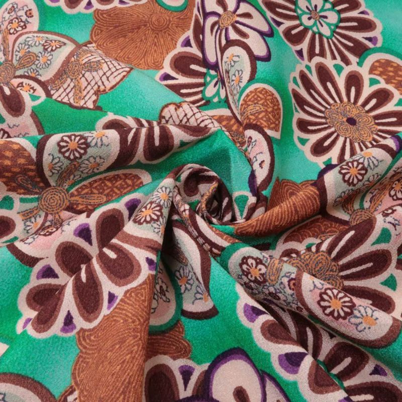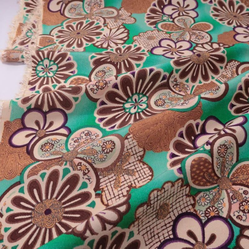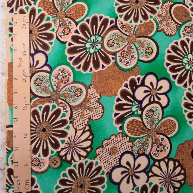 きれいなエメラルドグリーンの縮緬 一越ちりめん生地 菊と梅(グリーン) 10cm単位 切り売り