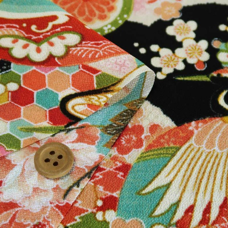 ●鶴と扇の描かれた日本らしい柄が黒地に描かれ、華やかで美しいです。鶴の柄はえてして古くさい感じがすることもありますが、この生地の鶴は上品でかわいい姿のせいか、全体的に古典柄の良さを感じさせる美しい印象に仕上がっています。