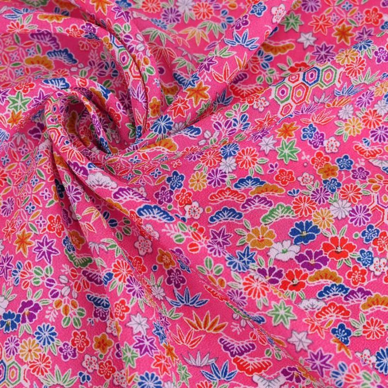 おめでたい模様がにぎやか 一越ちりめん生地 吉祥植物柄(赤) 10cm単位 切り売り