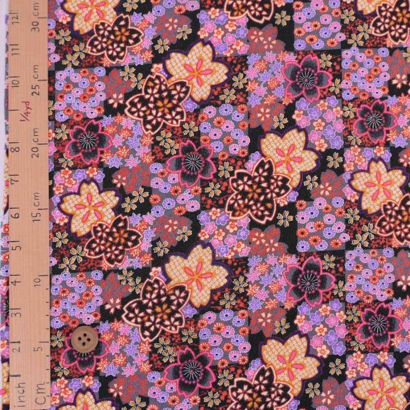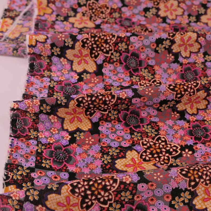 桜、梅、菊、紅葉でいっぱい 一越ちりめん生地 市松に四季花(納戸色) 10cm単位 切り売り