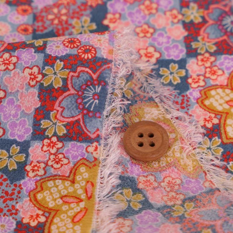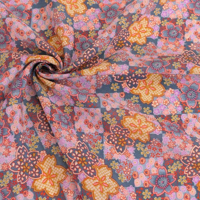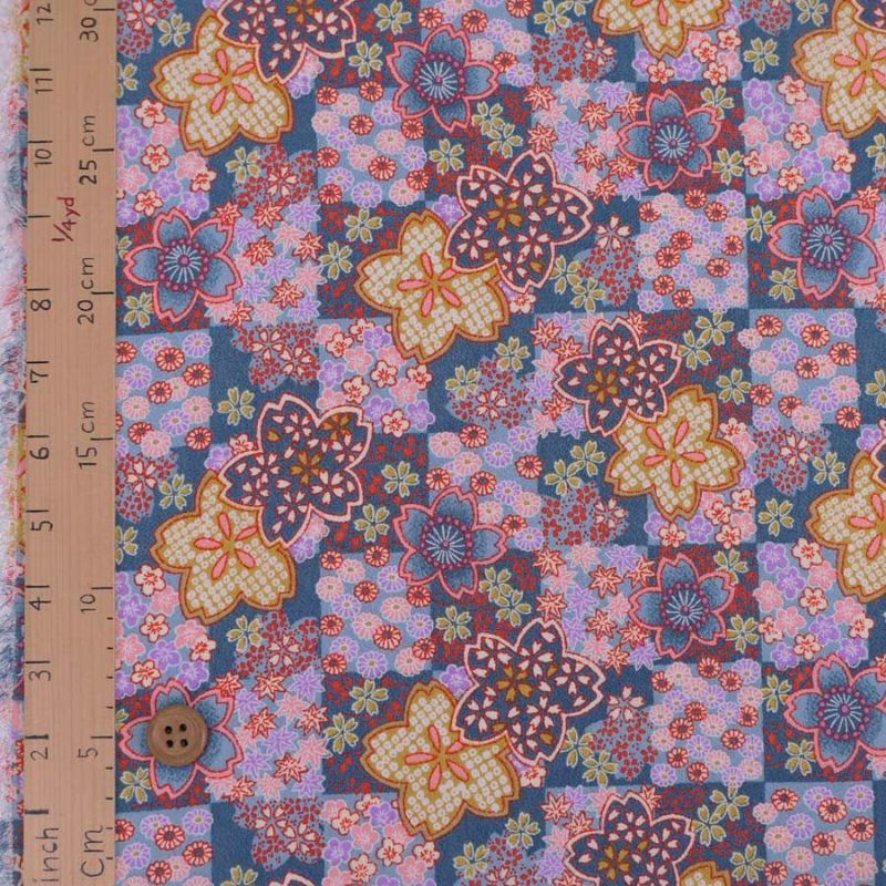 一越ちりめん生地 市松に四季花(納戸色) 10cm単位 切り売り