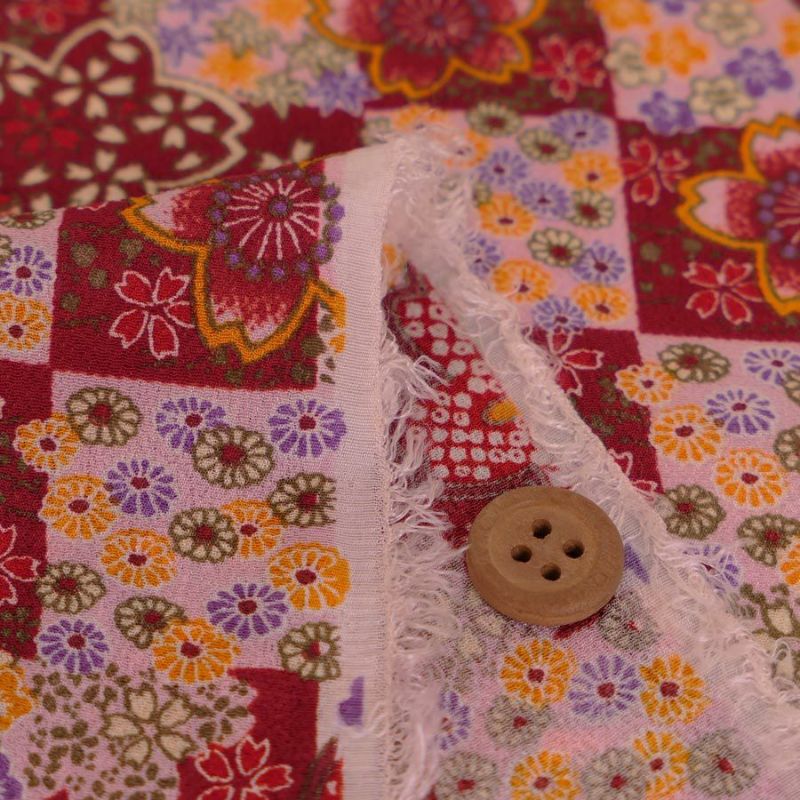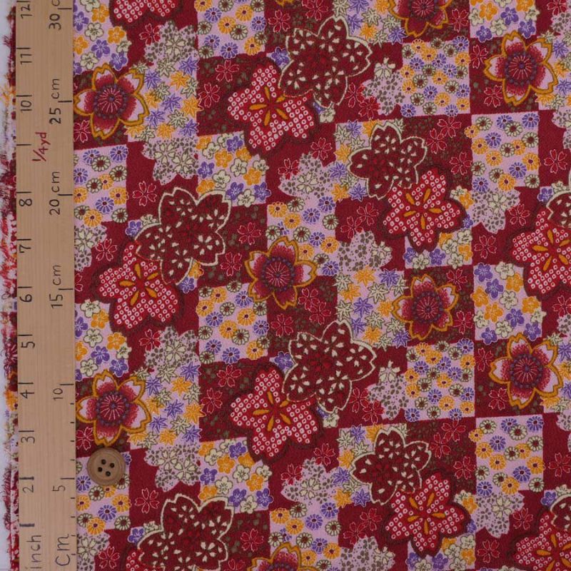 一越ちりめん生地 市松に四季花(えんじ) 10cm単位 切り売り