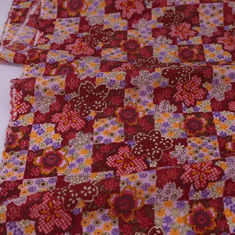 シックな赤系のひとこしちりめん 一越ちりめん生地 市松に四季花(えんじ) 10cm単位 切り売り
