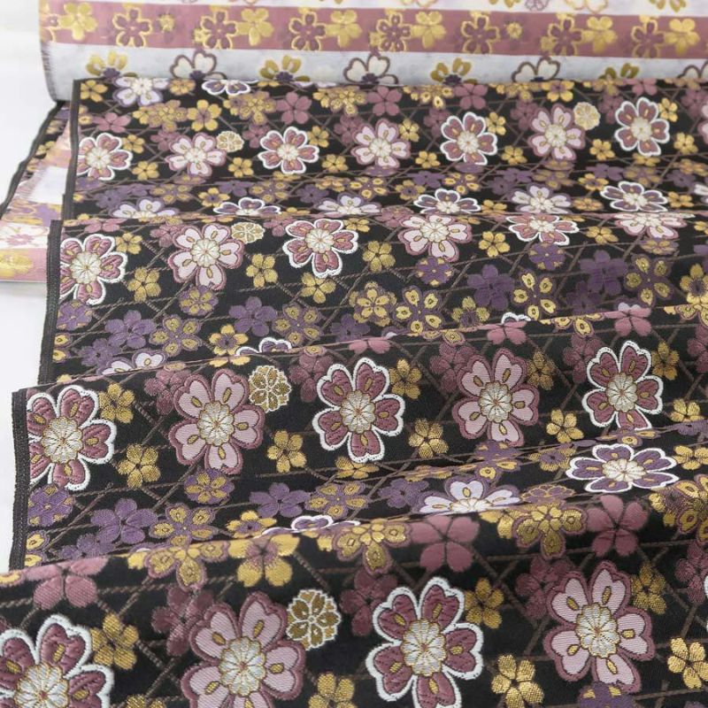 バッグや和小物に 金襴生地(金らん) かごめ模様に満開桜(黒/灰紫) 10cm単位 切り売り