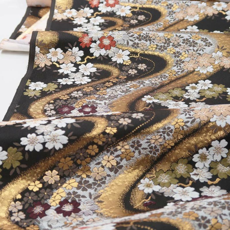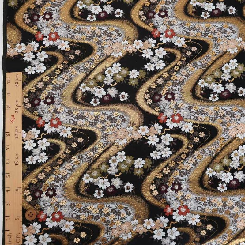 衣装や小物に 金襴生地(金らん) 雪輪尽くし花模様(黒) 10cm単位 切り売り