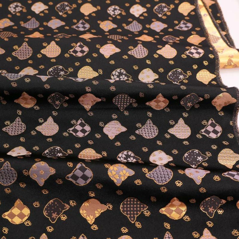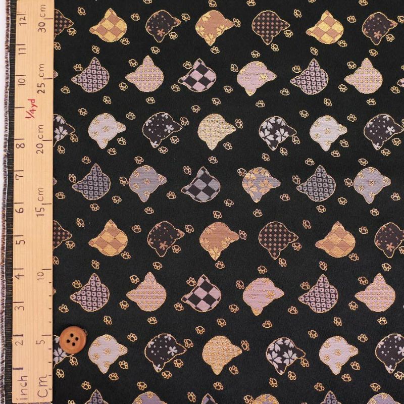 小さな猫の足跡もポイント☆ 金襴生地(金らん) ねこ型に伝統柄(黒) 10cm単位 切り売り