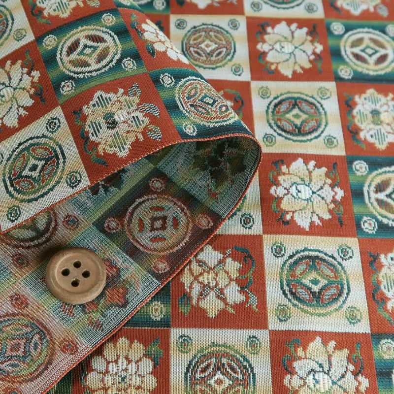 石畳文様(大ぶりの市松文様)の中に、唐花や牡丹などの花と七宝を配置しています。石畳ひとつ分のサイズは約3.2×3.5cmと、ほどよい大きさ。格式高い柄で手づくりを楽しんでください。