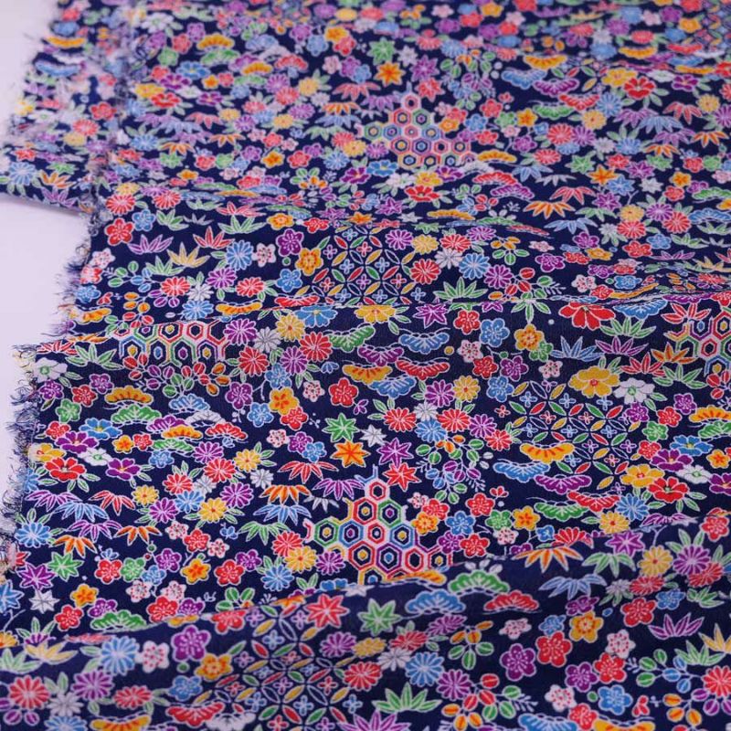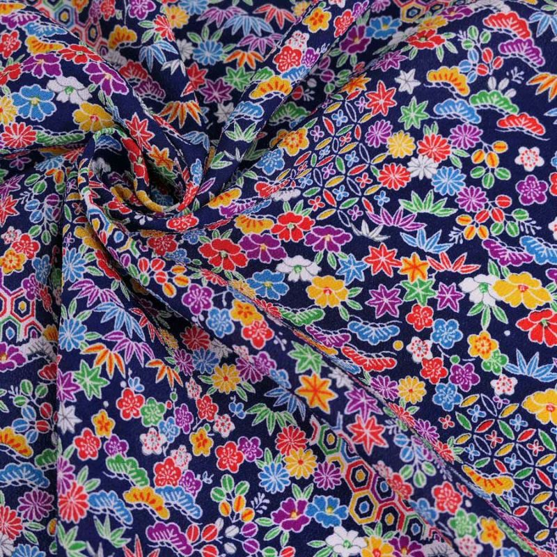 ちりめん細工の小物づくりに 一越ちりめん生地 吉祥植物柄(紺) 10cm単位 切り売り
