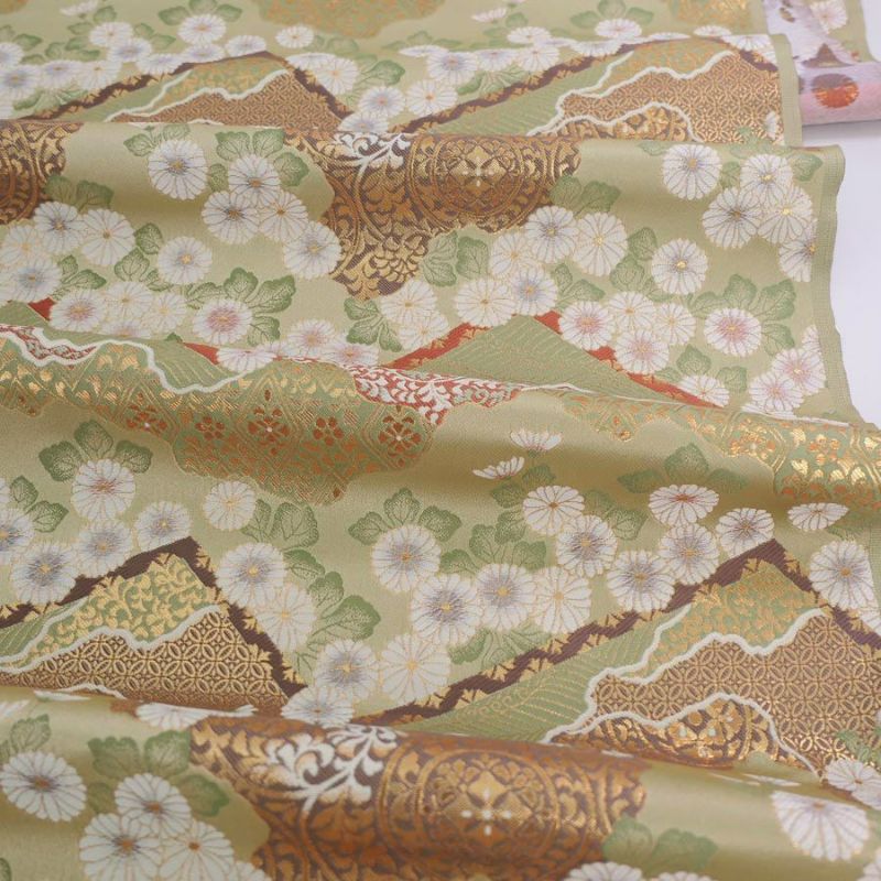 豪華で上品な和モダンテイスト 金襴生地(金らん) 山型切りばめ風道長菊花(浅緑) 10cm単位 切り売り