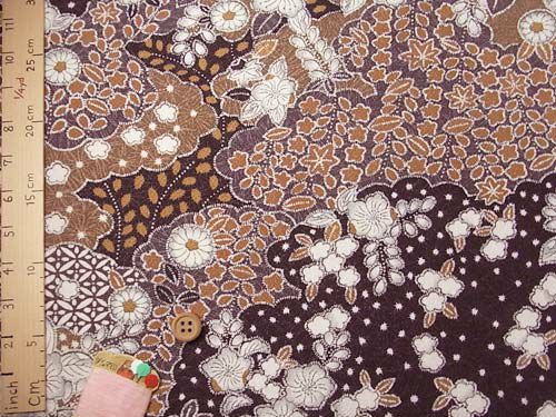 古布調ちりめん生地 雲取り地に花と橋(渋あずき色) 10cm単位 切り売り