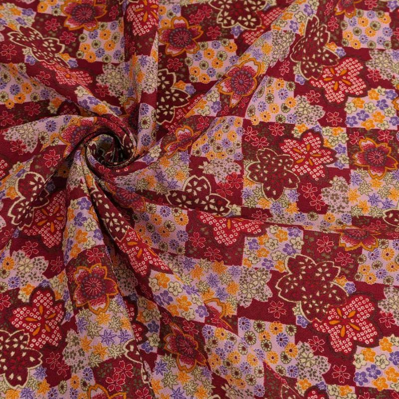 おとなっぽい可愛さが魅力的 一越ちりめん生地 市松に四季花(黒) 10cm単位 切り売り