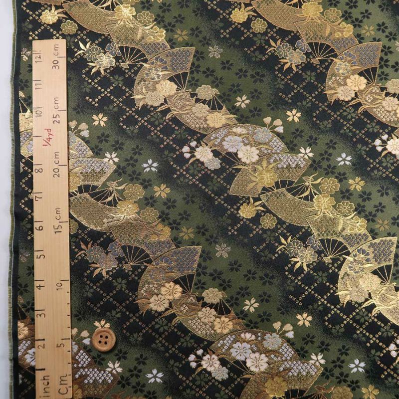 渋い色にゴールドの華やぎ 金襴生地(金らん)斜取り扇面桜(黒/老緑おいみどり) 10cm単位 切り売り