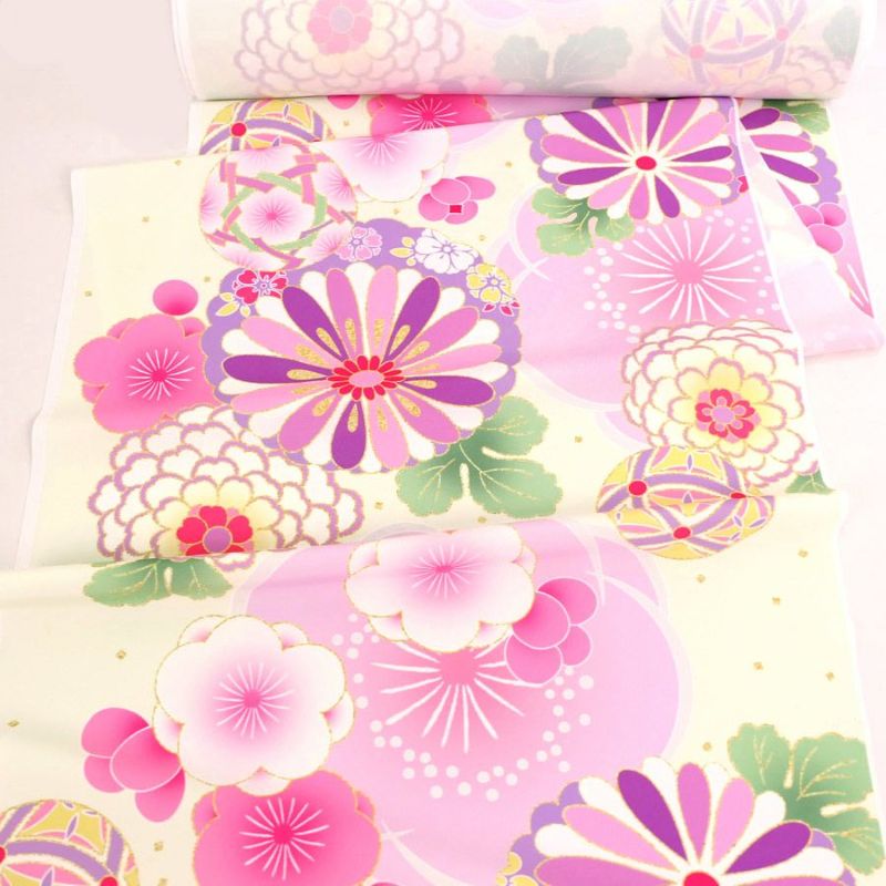 着物用洗える小幅生地 大輪の梅と毬(ラベンダー) 1反売り(約12m)女の子きもの反物 七五三女子に かわいい明るい花柄 手鞠柄