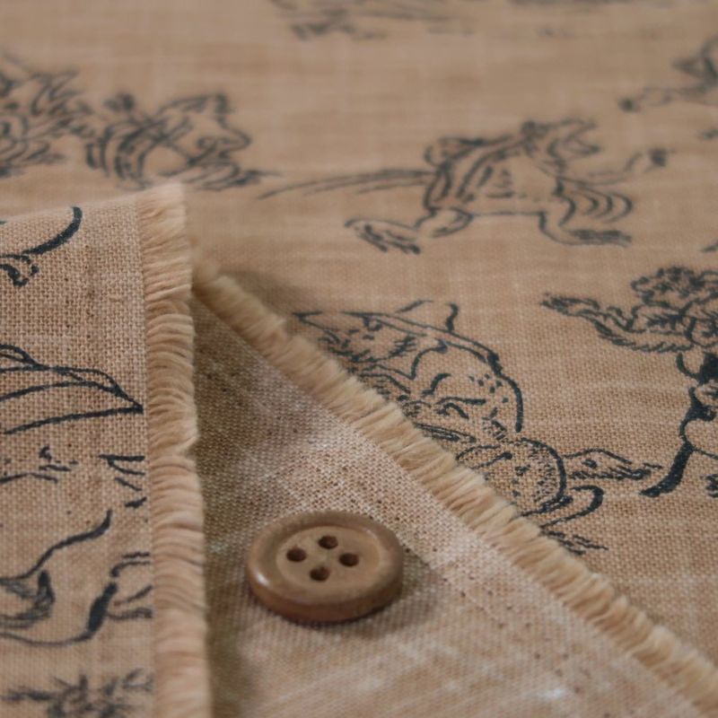 国宝の鳥獣戯画を模した柄 和柄コットン生地・鳥獣人物戯画(きゃら色) 10cm単位 切り売り
