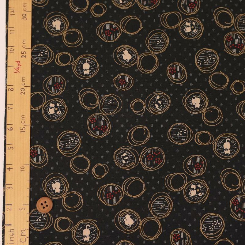 ねこ好きの方に☆和の猫柄24種! 手染め和風コットン生地・匠 ねこあそび(黒) 段単位 切り売り