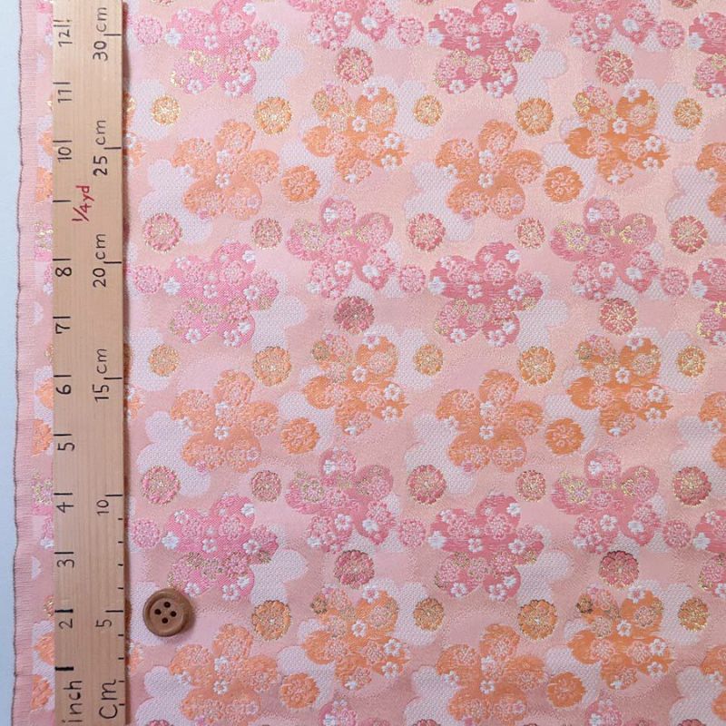 かわいい色柄の西陣織きんらん 金襴生地(金らん) 流水に夜桜と蝶(アイボリー/ピンク) 10cm単位 切り売り