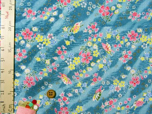 ちりめん生地 流水に春秋花と蝶(青) 10cm単位 切り売り