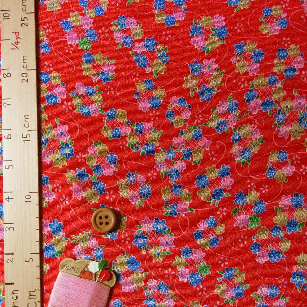 ちりめん生地・流水に花とくし柄(赤) 10cm単位 切り売り