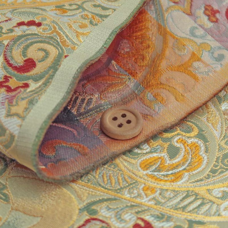 この生地は使いやすいように一般の帯幅(約34cm)ではなく70cmの広幅で織られています。また、絹ではなくポリエステル中心の素材ですので、価格の面でも使いやすくなっています。適度なハリもあり、きっと思ったよりも扱いやすい素材ですので、自由な発想でいろいろな目的に使ってみてください。