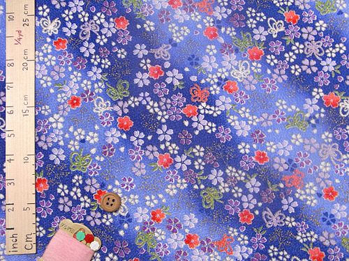 小物に使いやすい柄のちりめん生地です ちりめん生地・桜とリボン蝶(青) 10cm単位 切り売り