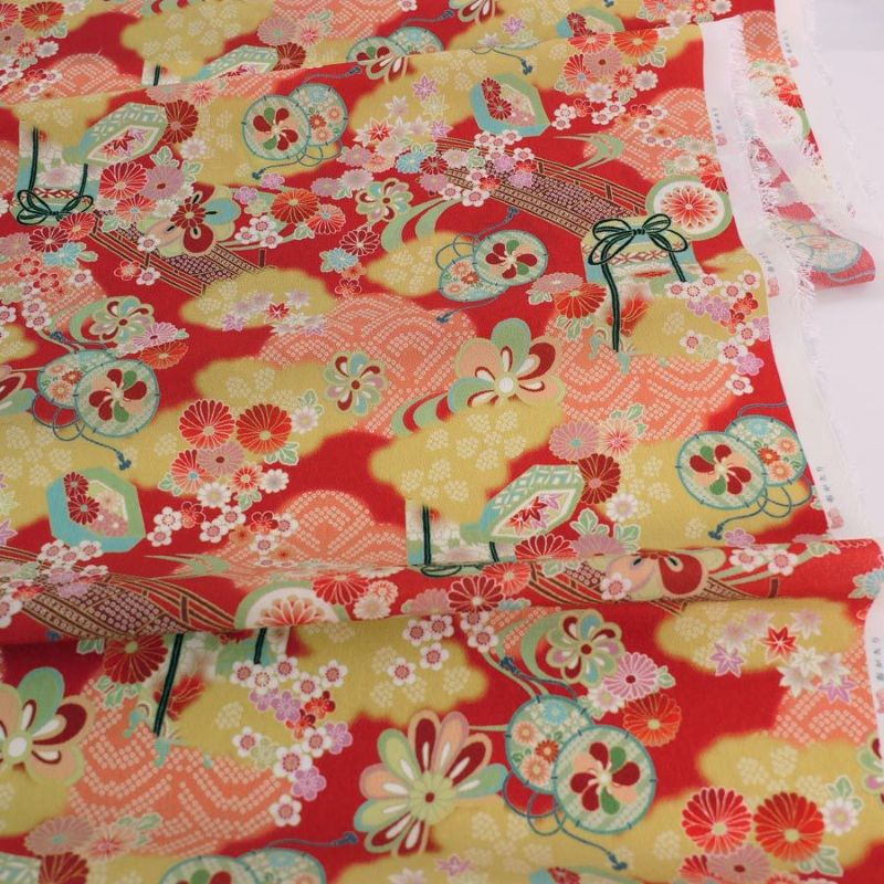 美しい古典柄で手芸やつまみ細工 一越ちりめん生地 貝桶と花鼓(赤)【布がたりオリジナル】10cm単位 切り売り