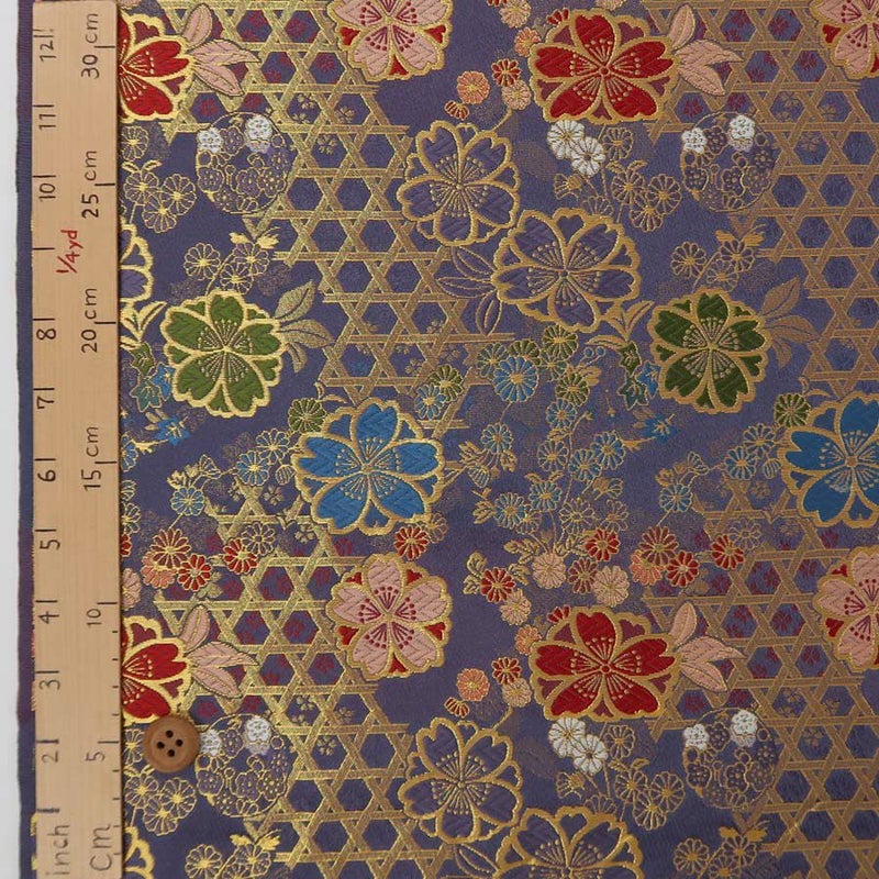 渋派手でおしゃれな色 金襴生地(金らん) 八重桜にかごめ文様(藤はとば色) 10cm単位 切り売り