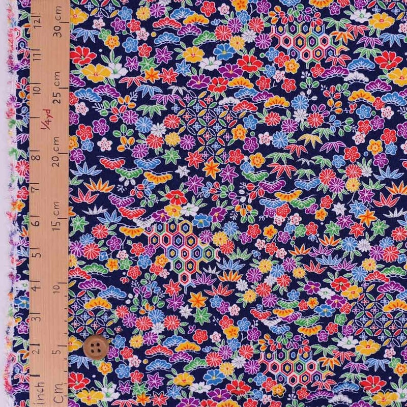 ちりめん細工の小物づくりに 一越ちりめん生地 吉祥植物柄(紺) 10cm単位 切り売り