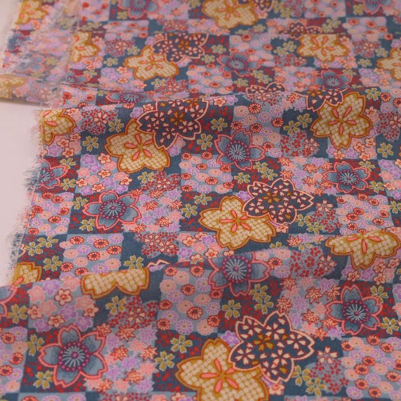 おとなっぽい可愛さが魅力的 一越ちりめん生地 市松に四季花(黒) 10cm単位 切り売り