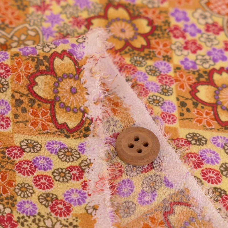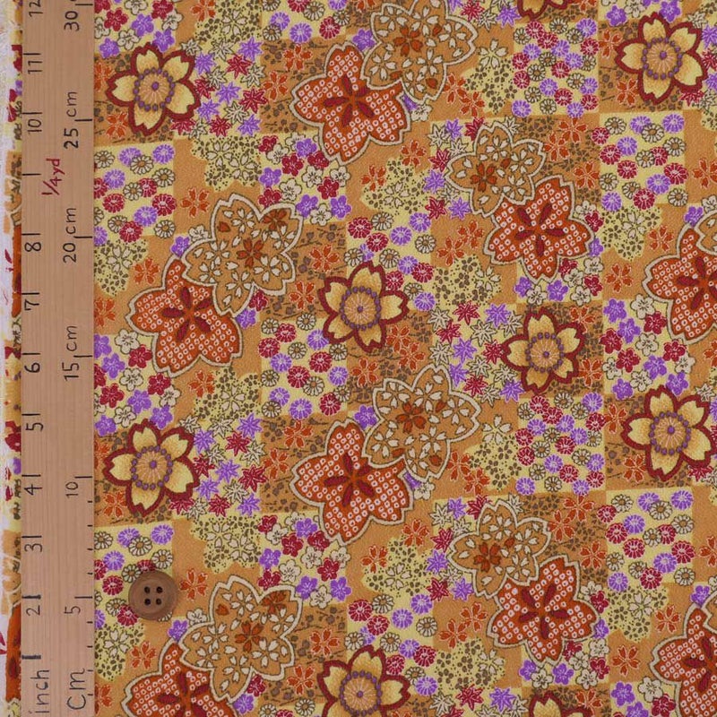 レトロな色合いが素敵♪ 一越ちりめん生地 市松に四季花(山吹) 10cm単位 切り売り