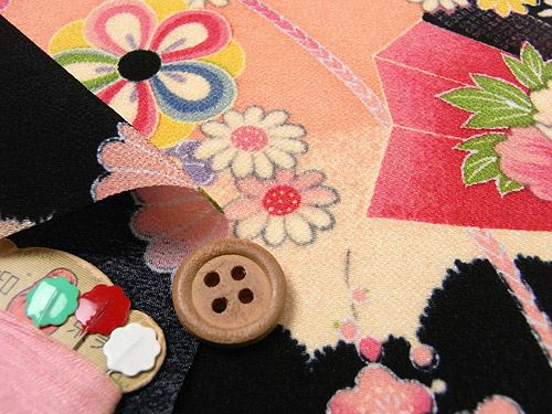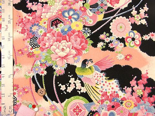 ●この黒は、黒と薄いピーチ色が基調になっています。赤やピンク系の花もきれいになじんでいます。一越ちりめんカットロール・柄の黒にはこの布も使われています。
