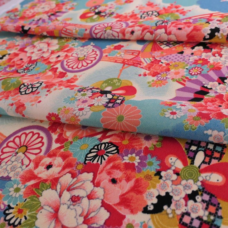 商品案内 京都の友禅工場に保存されていた50年程前の友禅型をそのまま使って手捺染で染め上げた生地です。当時、女の子の着物用に製作されたもので、懐かしい雰囲気いっぱいの古布再現ちりめんです。手捺染(説明は下に)ならではの精緻な柄も魅力。柄も大きすぎず使いやすいと思います。