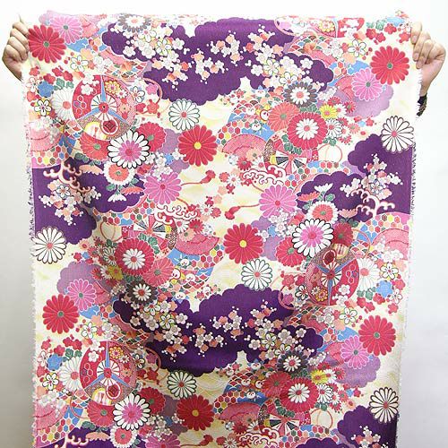 昔の柄を再現した、豪華なちりめん生地 古布再現ちりめん生地・平安花車模様(紫) 10cm単位 切り売り