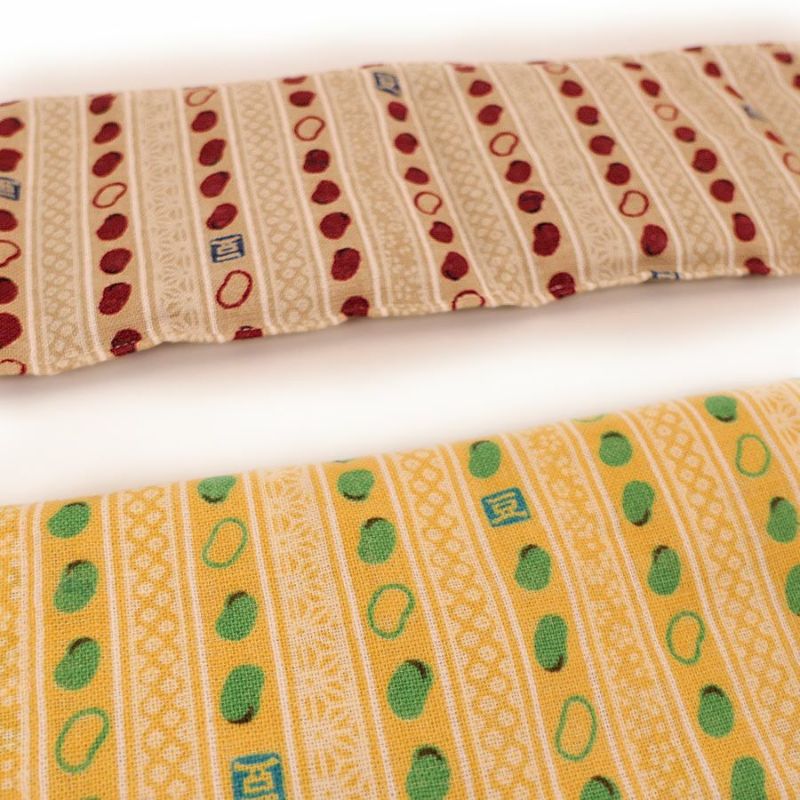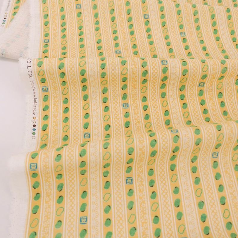 麻の葉やかのこ柄などの伝統柄による縞もようと、並んだお豆たちがとってもカワイイ木綿生地。所々に入った「豆」の刻印がリズミカルで遊び心にあふれています。よく見ると水引で結ばれたお豆も。