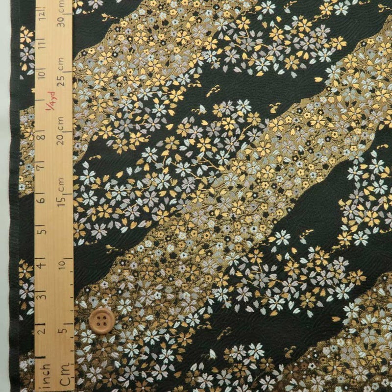 背景の黒色が絶妙な人気柄金襴! 金らん・波地紋に雅桜(黒) 10cm単位 切り売り