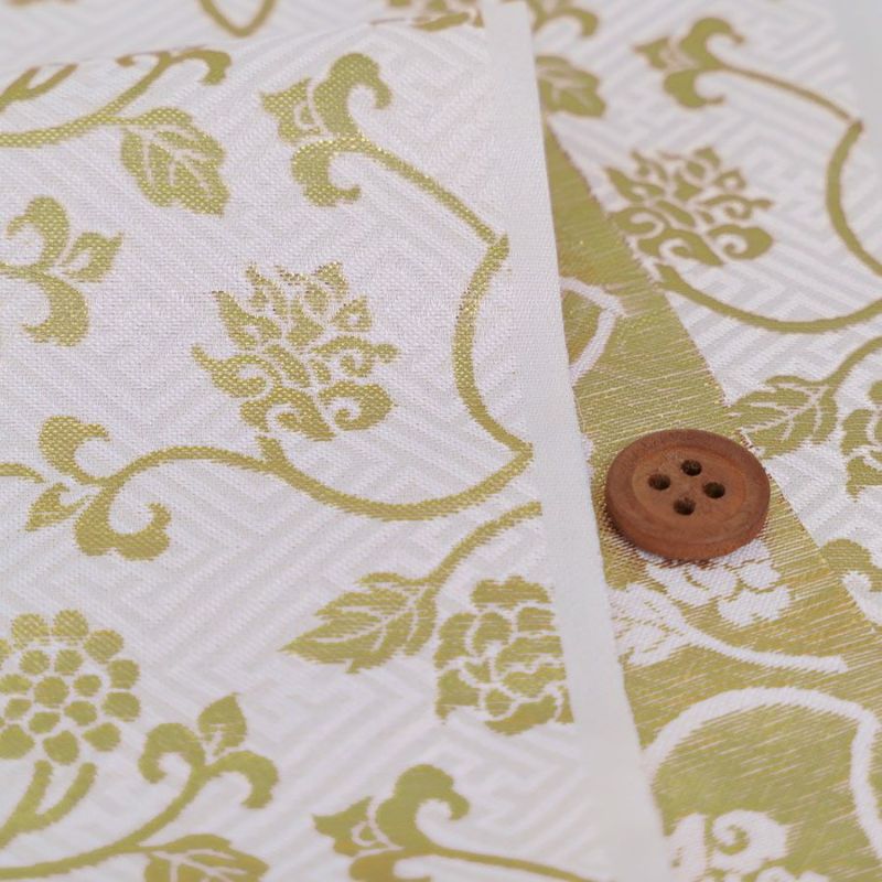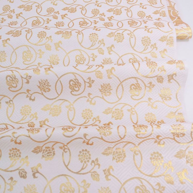 「金らん・さやがたに花唐草(白)」とデザインがよく似ていますが、それに比べるとこちらの方が柄が大きくダイナミックで、衣装や七五三の袴にもおすすめです。