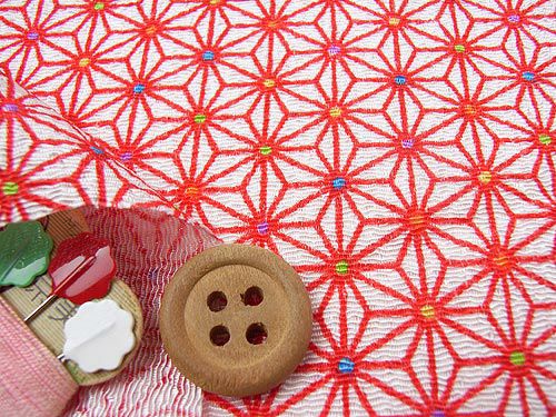商品案内 赤い線で描かれた麻の葉柄に、ビーズを散りばめたようなカラフルなアクセントが入りとっても可愛らしいちりめん生地。このようなベーシックな柄は、やはり何かと重宝です。ちりめん細工にもご活用くださいね。