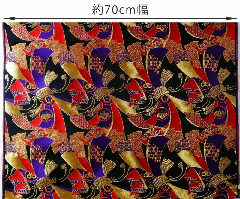 商品案内 大きな束ね熨斗(たばねのし)柄の金らん生地。大柄ののし柄が目をひき、赤と紫と黒のコントラストがひときわ個性的です。