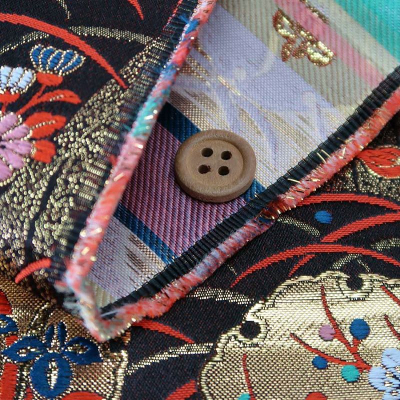 この生地は使いやすいように一般の帯幅(約34cm)ではなく70cmの広幅で織られています。また、絹ではなくポリエステル中心の素材ですので、価格の面でも使いやすくなっています。適度なハリもあり、きっと思ったよりも扱いやすい素材ですので、自由な発想でいろいろな目的に使ってみてください。