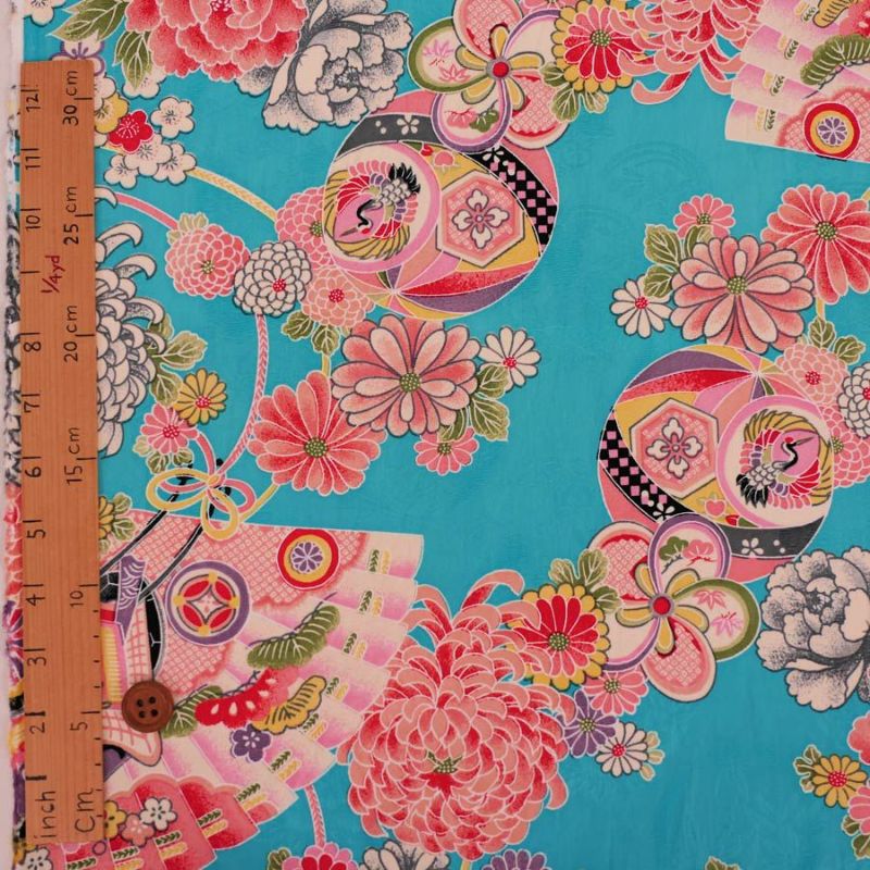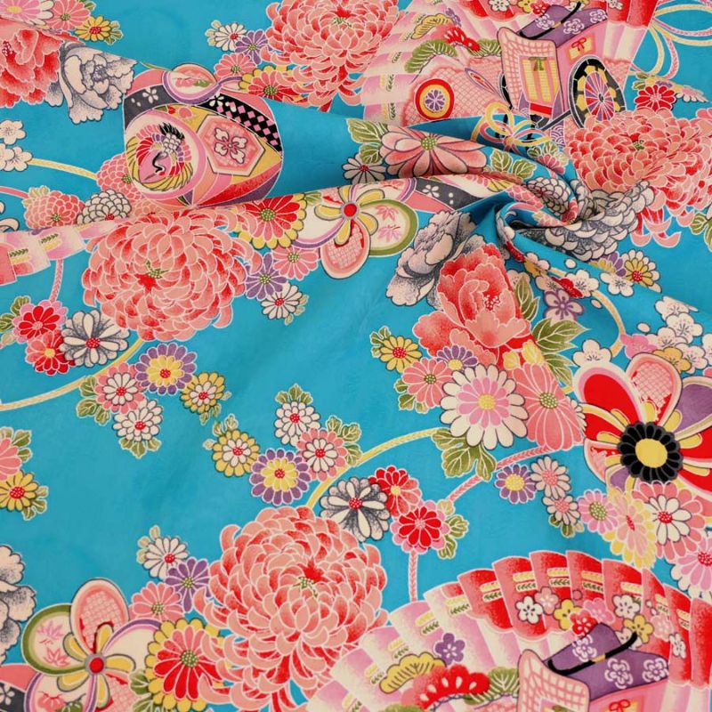 古布を再現した豪華な柄 レーヨンりんず 御所車に花扇(青) 10cm単位 切り売り