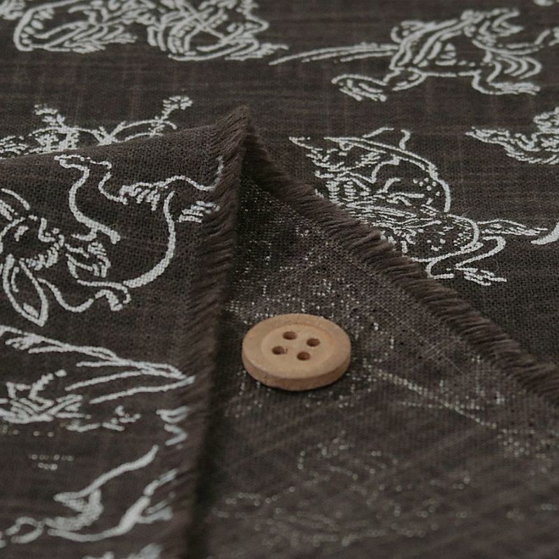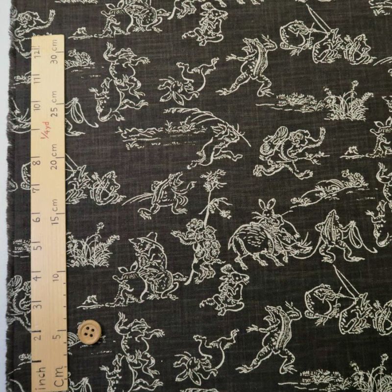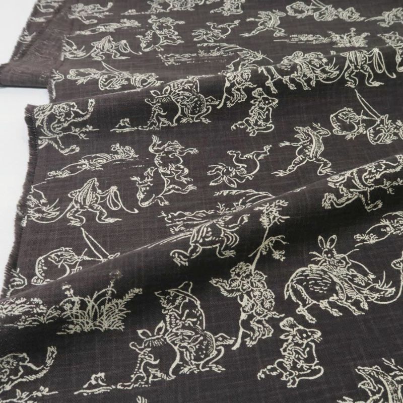 国宝の鳥獣戯画柄、ムラ糸の素朴な生地 和柄コットン生地・鳥獣人物戯画(紺) 10cm単位 切り売り