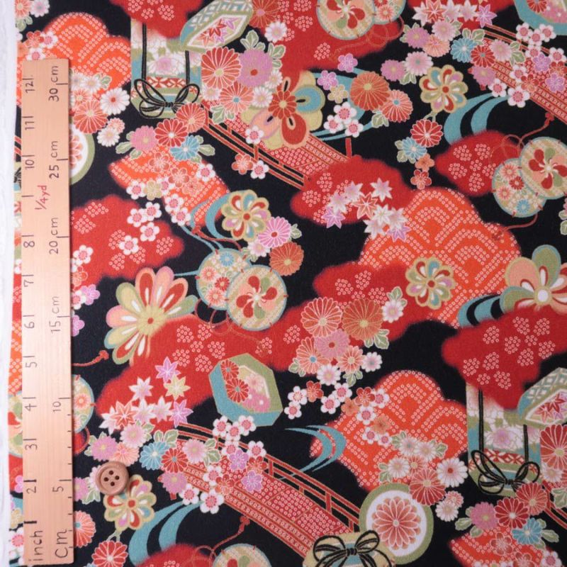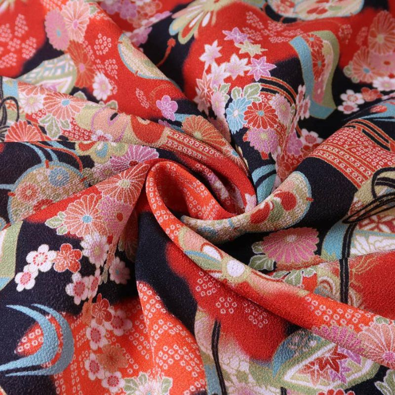 やさしい色の上品な古典柄 一越ちりめん生地 貝桶と花鼓(クリームアイボリー)【布がたりオリジナル】 10cm単位 切り売り