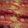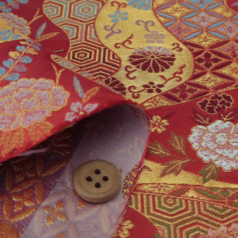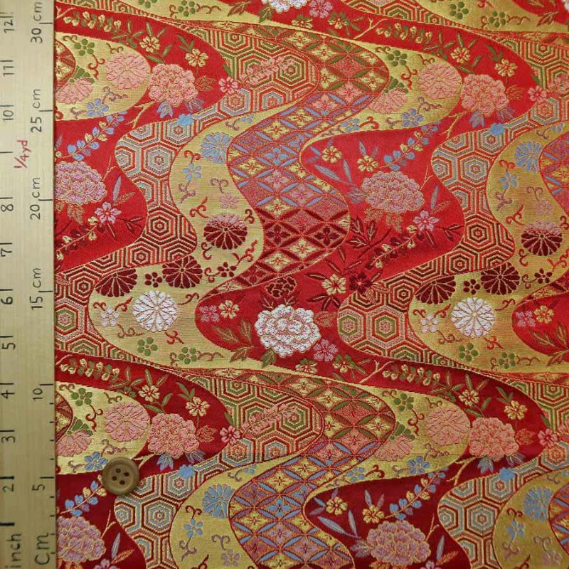 豪華な西陣織 金襴生地(金らん) 花と伝統柄の金波模様(赤) 10cm単位 切り売り
