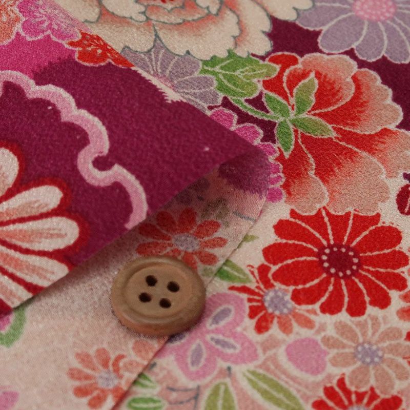 このちりめんは手捺染~布の上に型を置き、人の手によって染めていく方法で染色されました。機械染めよりはるかに手間がかかりますが、機械では不可能な多色使いにより深みのある精巧な染めが可能です。実物をご覧いただくと納得していただけると思います。