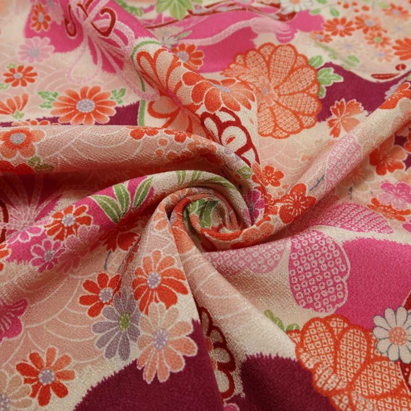 一越ちりめん生地 青海波に御所車(ピンク/赤紫)
