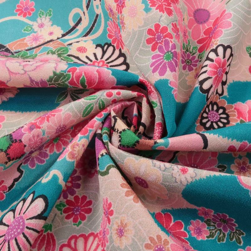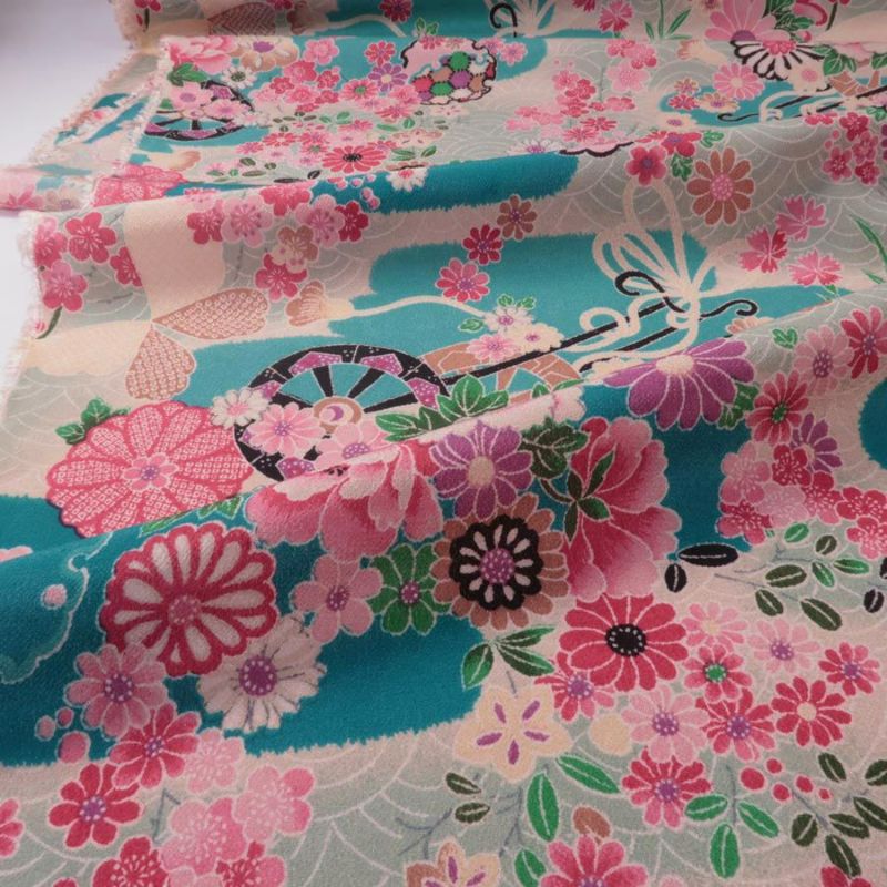 古布調の縮緬、手芸に。 一越ちりめん・青海波に御所車(赤/紫) 10cm単位 切り売り