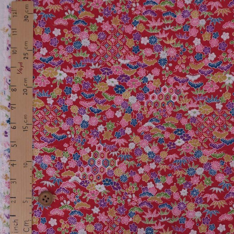 おめでたい模様がにぎやか 一越ちりめん生地 吉祥植物柄(赤) 10cm単位 切り売り