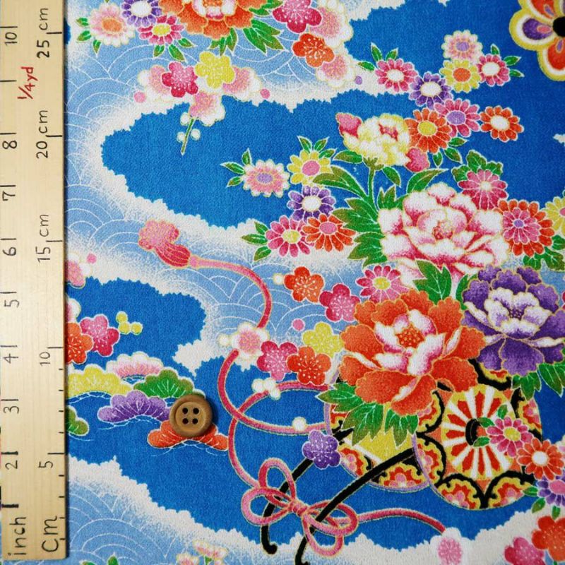 華やかな花御所車柄が素敵♪ 一越ちりめん生地 花御所車に手まり(青) 10cm単位 切り売り