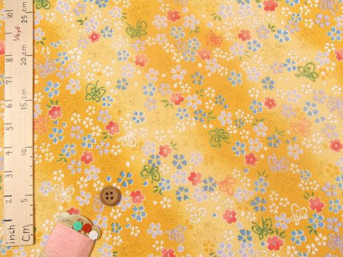 小物に使いやすい柄のちりめん生地です ちりめん生地・桜とリボン蝶(黄色) 10cm単位 切り売り