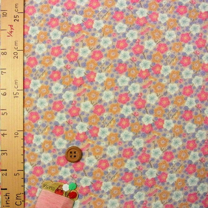3色の梅が可憐に咲き、その間には小さな丸い柄が入っています。どこを切り取っても柄が出るように柄密度を高くしていますので、ちりめん手芸や小物におすすめです。