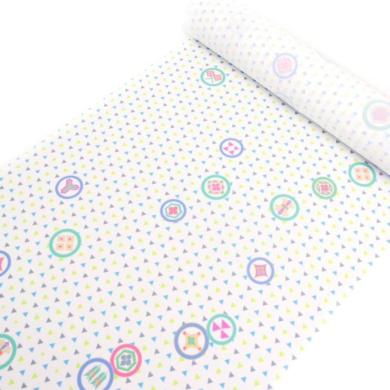 ●白地に柄が映えてポップで元気な雰囲気。三角形はブルー、グレー、蛍光色がかった緑みの黄色です。